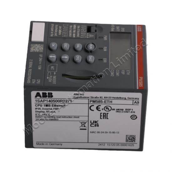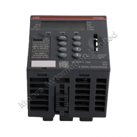 The ABB PM585-ETH module executes control logic, processes data, and coordinates system operations within an industrial control network.